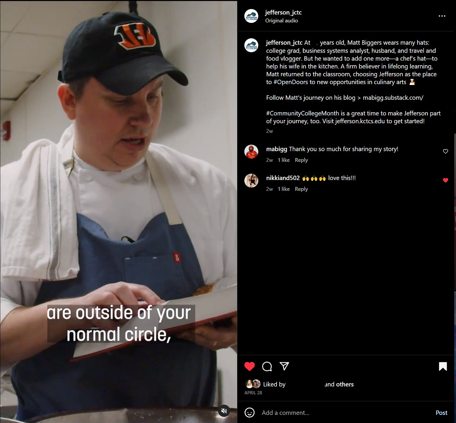 The one-minute vertical video idea turned into a multi-pronged marketing campaign to be launched in April to coincide with ‘Community College Month.’ It was our humble thought that the story of a 40-something year old accounting systems analyst taking cooking classes would inspire other potential students to register for classes, to try a new career path, or simply explore a subject purely for fun.